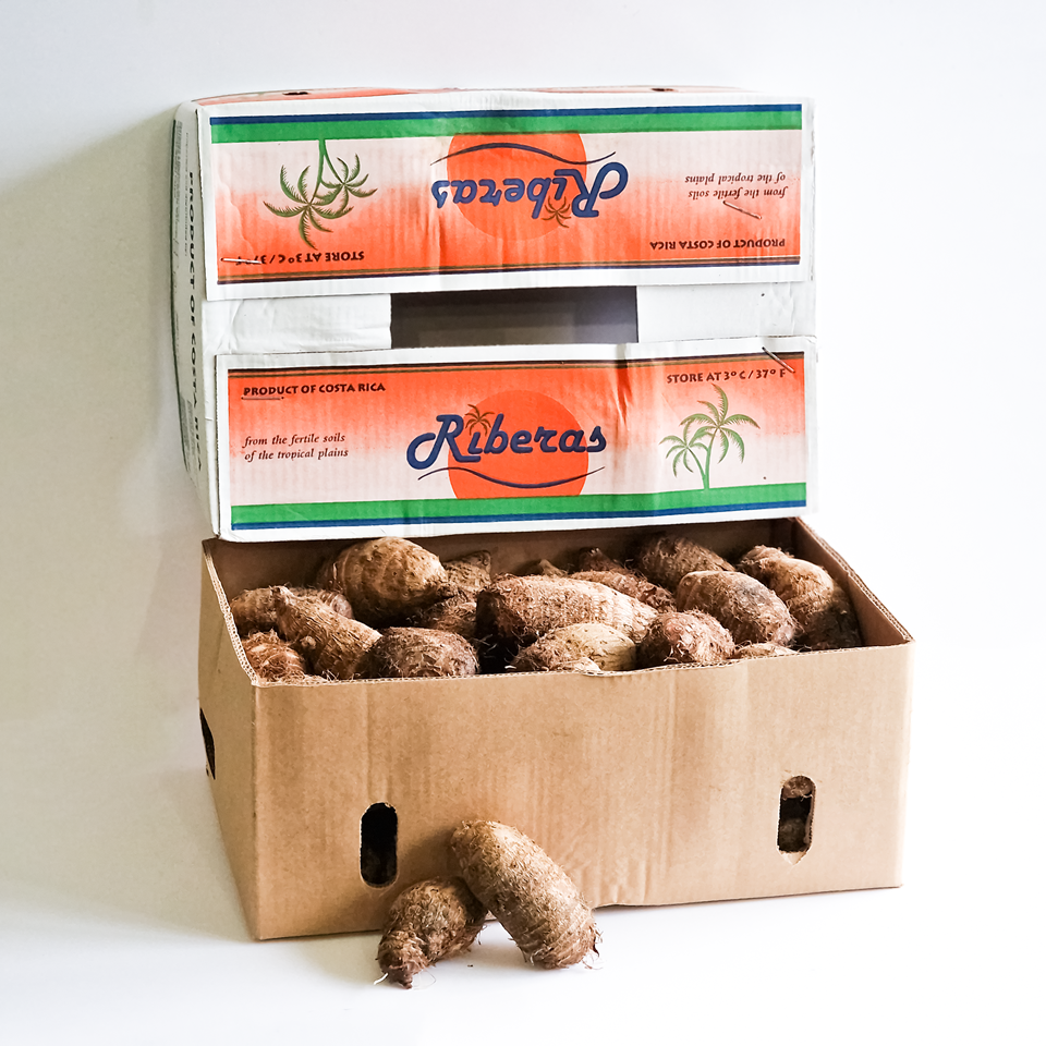 This is our Eddo, a starchy root of a tropical plant of the same name. It has a hard brown hairy skin and therefore looks like a coconut. (Caution: boil this root, as it is poisonous if eaten raw in large quantities. After cooking, the eddo is similar in structure to a potato but with a delicious nutty flavour.