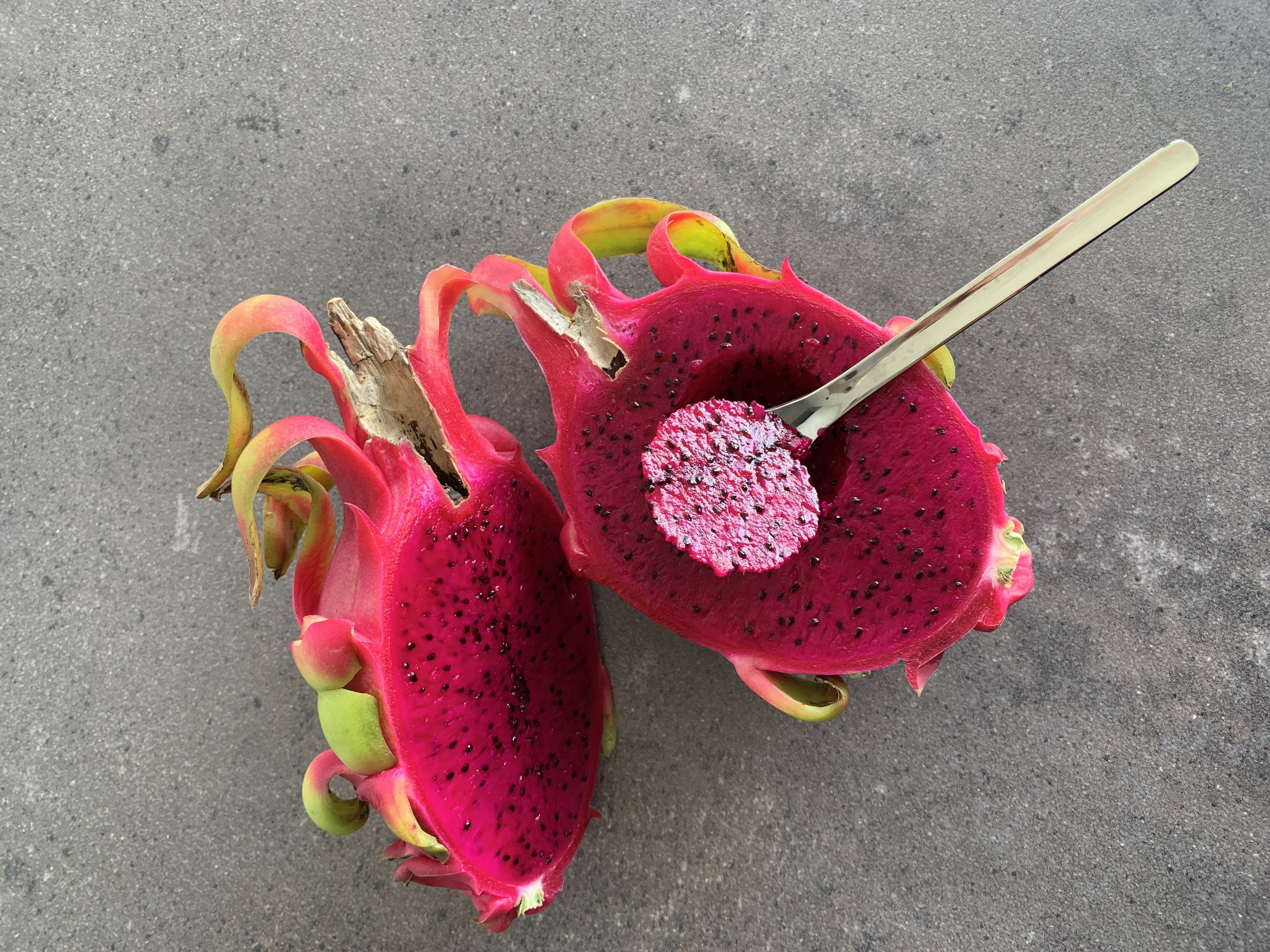 Die Pitahaya-Pflanze | 红龙珍珠果 ist eine Verwandte des Kaktus. Diese exotische Frucht wird auch Drachenfrucht genannt. Sie sieht nicht nur schön aus, die Pitahaya ist auch köstlich! Die Frucht hat eine rote oder gelbe (Dragon fruit / Pitahaya red & yellow) Schale und weißes oder rotes saftiges Fruchtfleisch mit kleinen schwarzen Kernen. Der leicht süße Geschmack erinnert an eine Kombination aus Melone und Kiwi. Die Frucht ist reif, wenn sie sich so leicht schälen lässt wie eine Banane.