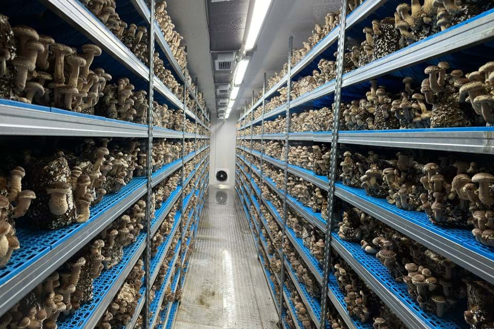 We are proud to announce that we are up and running with our local indoor mushroom growing. Mitrofresh has developed innovative containers were mushrooms are grown within a controlled environment. In collaboration with Mobi Mushroom and farm shop Hans Ravensbergen we started Shiitake plug & play production in Rhenen on November 9th 2023.