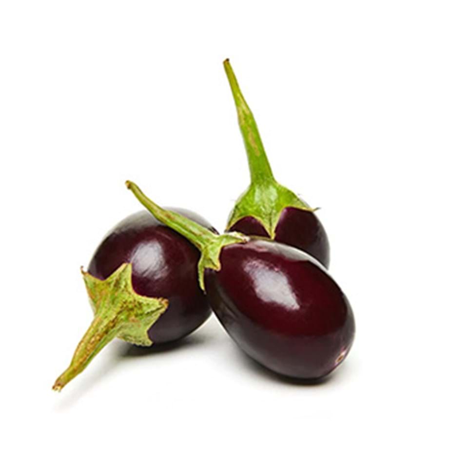 The mini aubergine purple. Cool on the outside and beautifully white and juicy on the inside. When cooked, it is full, tender, spicy and creamy in flavour. And it absorbs less moisture than the standard aubergine. A must try!