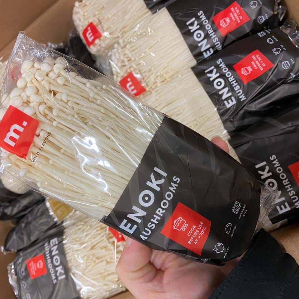 Ok, now we are looking at something different! This is our enoki, also called 'velvet leg'. Bundles of white velvet stems with little hats on them. Enoki grows in the dark and sometimes has spectacular shapes. Always boil, fry or deep-fry it before you eat it! The perfect mushroom for soup. With a fruit flavour.