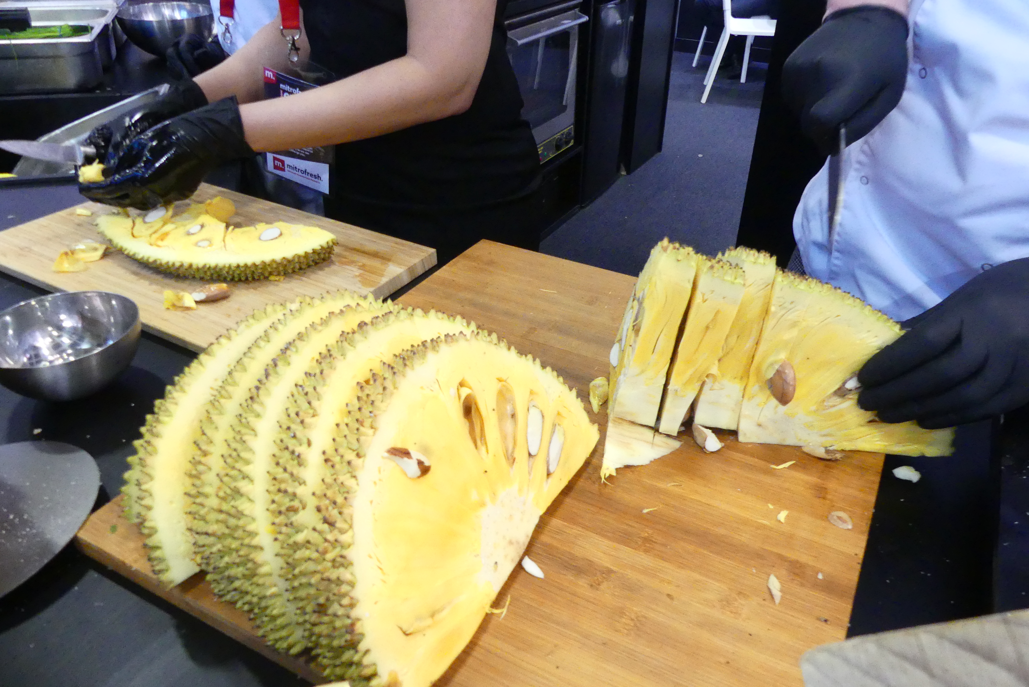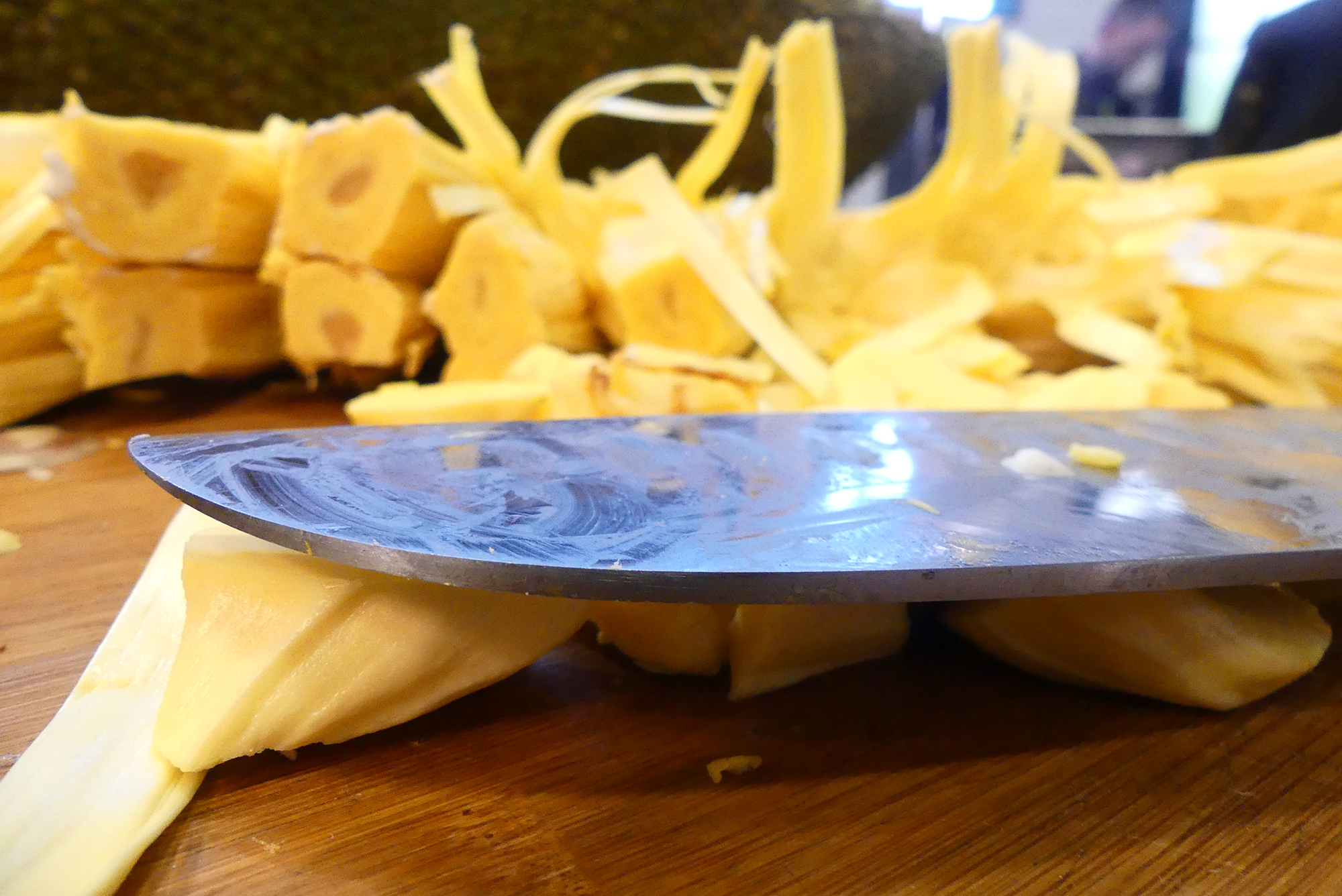 The jackfruit is a huge fruit (up to 90cm long and 40kg in weight). Originally from India, it is now found in half of Asia, Africa and South America. Like its stinky brother, the durian, it grows directly on the stem, but has slightly less dangerous looking tips. The ripe jackfruit contains edible segments, which taste a bit like a combination of pineapple, banana and mango. The structure is firm and crispy. Unripe jackfruit, on the other hand, is not sweet and is often used as a meat substitute.