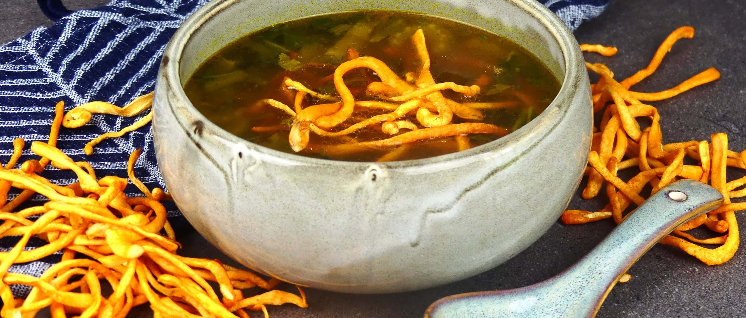 This warm and nourishing cordyceps soup is delicious all year round. A chicken broth base is gently seasoned with turmeric and sesame oil. Sweet and nutty cordyceps mushrooms are slowly simmered together with the Pak Choi.