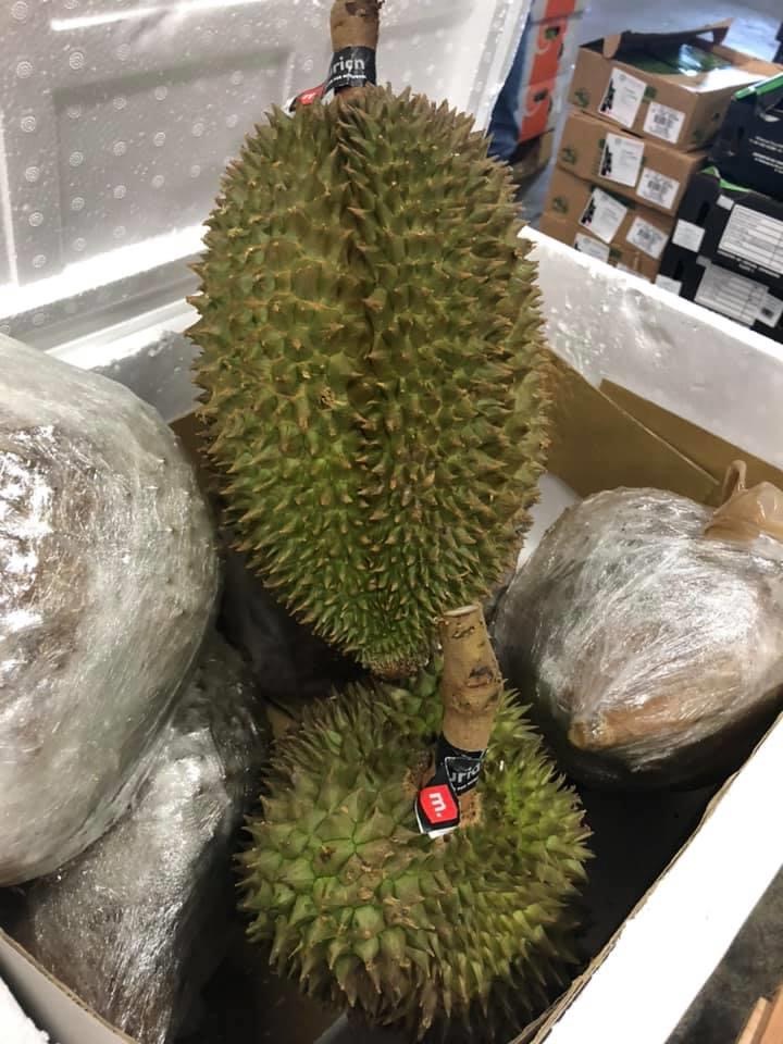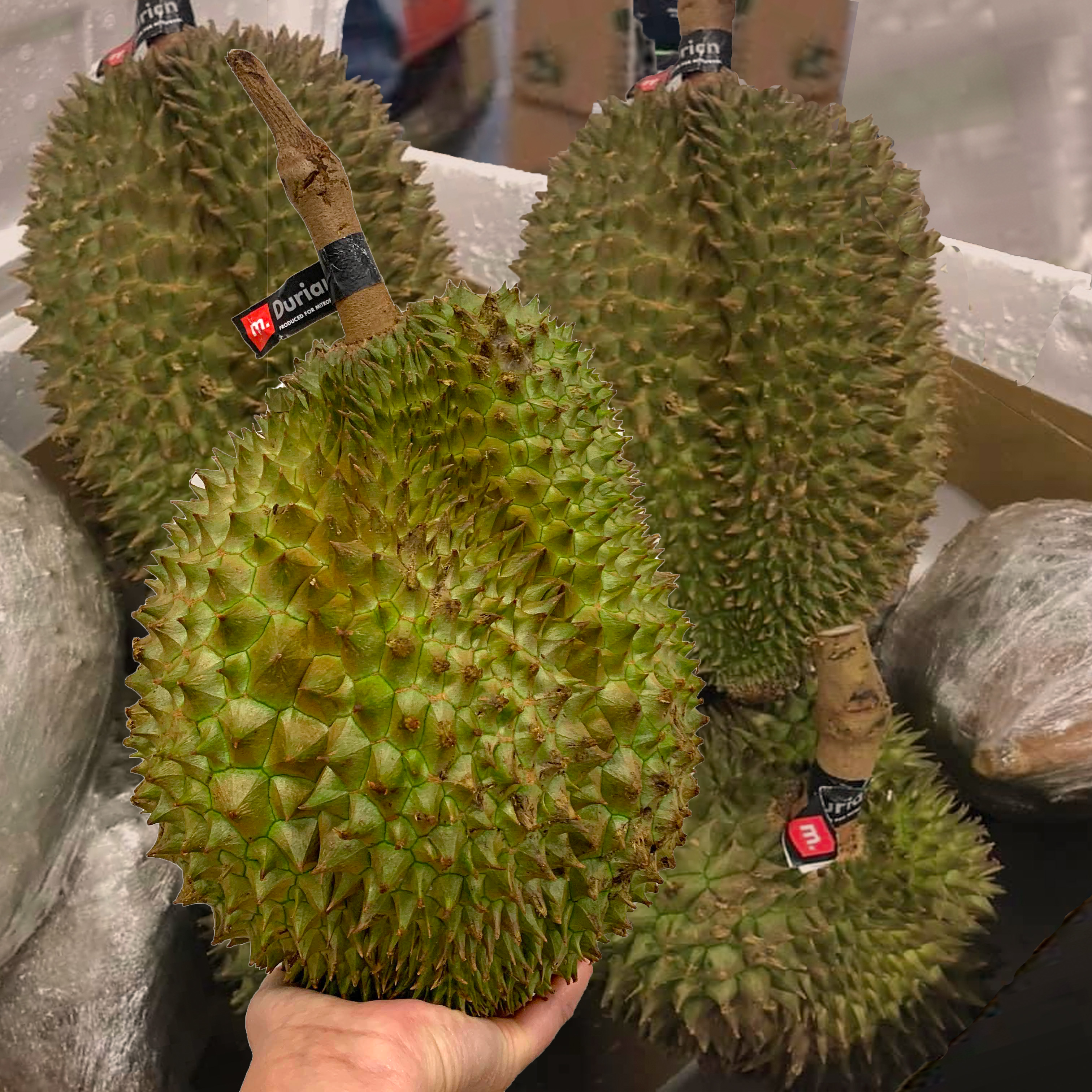 Le durian est un fruit tropical vert-jaune-brun « punk » d’Indonésie, de Thaïlande et de Malaisie, aussi gros qu’un ballon de rugby plein de pointes redoutables avec comme des espèces de tangerines à l’intérieur, mais d’une structure totalement différente, sans peau et avec un noyau orange-marron dans chaque particule. La structure est un peu charnue, mais se défait dans votre bouche, comme un pudding crémeux, gras et ferme. Le goût est sucré, aigre et pique la langue comme un vin pétillant. Le goût rappelle un peu une banane légèrement fermentée, d’autres croient reconnaître un goût d’amande, parfois de l’oignon et de l’ail. Mais le durian est plus connu pour son odeur âcre. Plus il est mûr, plus c’est pénétrant. Cela diffère aussi selon les variétés.