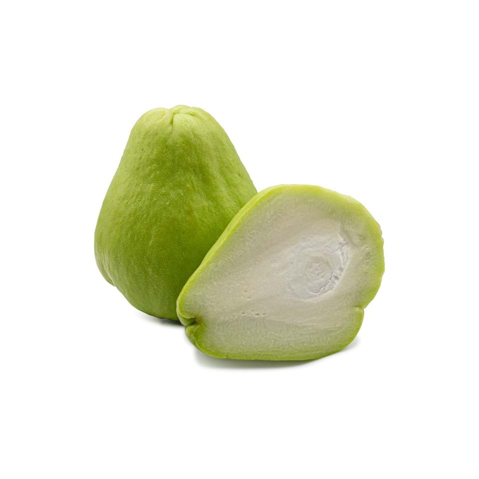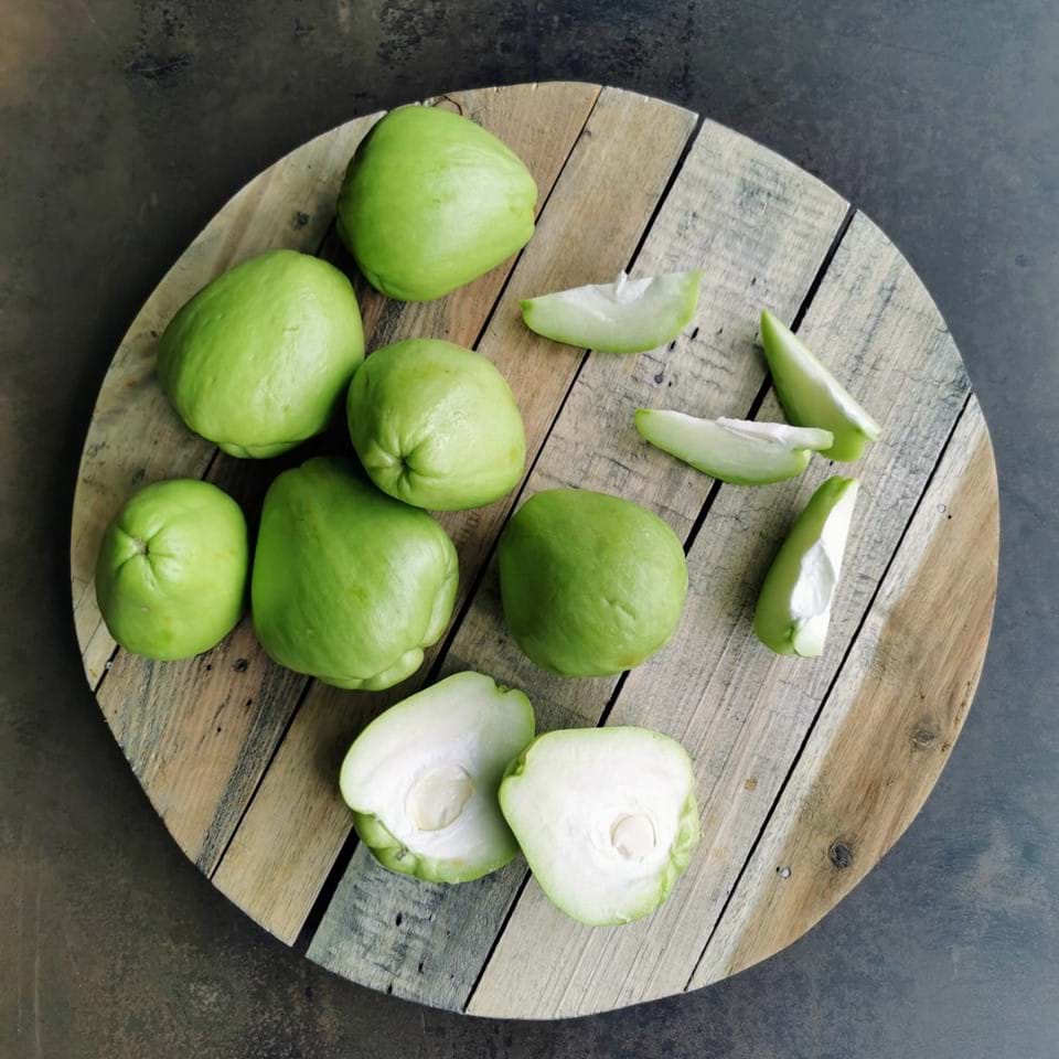 Onze Chayote, een peervormige vrucht, geelgroen van kleur met een gladde schil. Hij is familie van de meloen, courgette en komkommer. Vorm en smaak.
