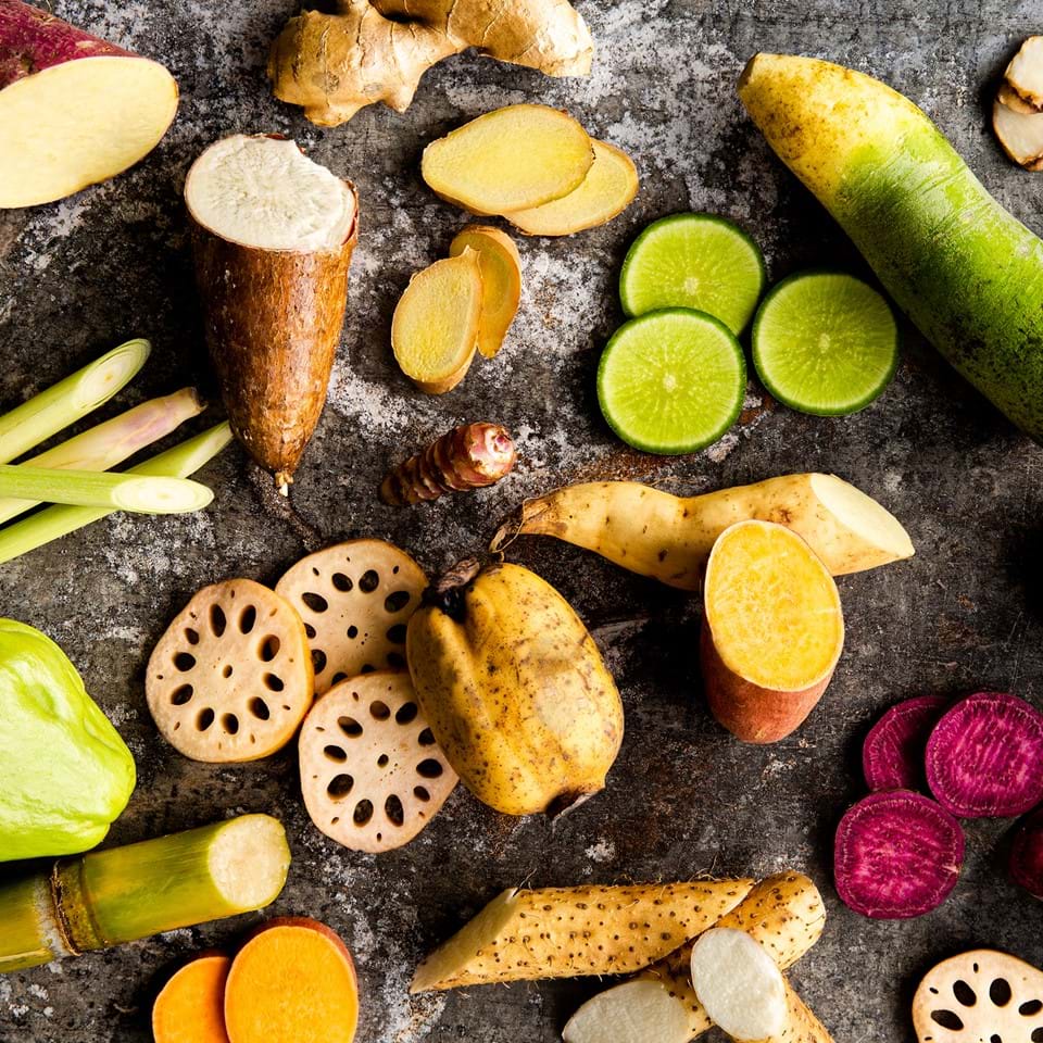 Deze Aziatische veggie heet Klaroen. Sommige kennen hem als hing choi, of hin choy. Deze kruidachtige groenteplant en lijkt een beetje op spinazie. Hij heeft grote en kleine bladeren en valt erg in de smaak door de prachtige paarse stripes op zijn groene bladeren. Tijdens het koken kleuren die zelfs rood. Real nice! Je koopt deze beauty in de Aziatische supermarkt.