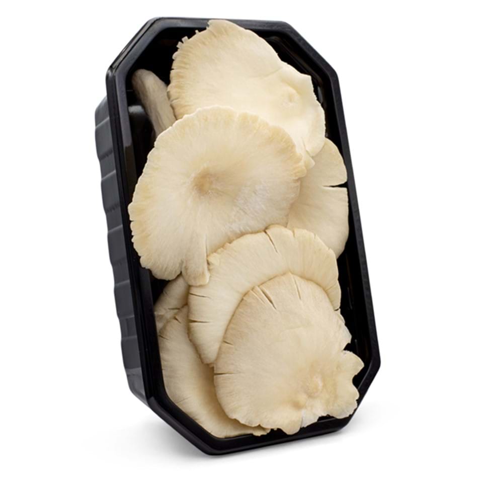 Dit is onze oesterzwam, ook bekend als Pleurotus Ostreatus. Wat betekent 'oester met zijoor'. Vernoemd naar de aanhechting van de steel en de oestervormige paddenstoel hoed. De smaak van de oesterzwam is zeer mild. Sommigen omschrijven het als subtiel houtachtig, anderen als zeevruchten. Hij heeft een zeer vlezige textuur.