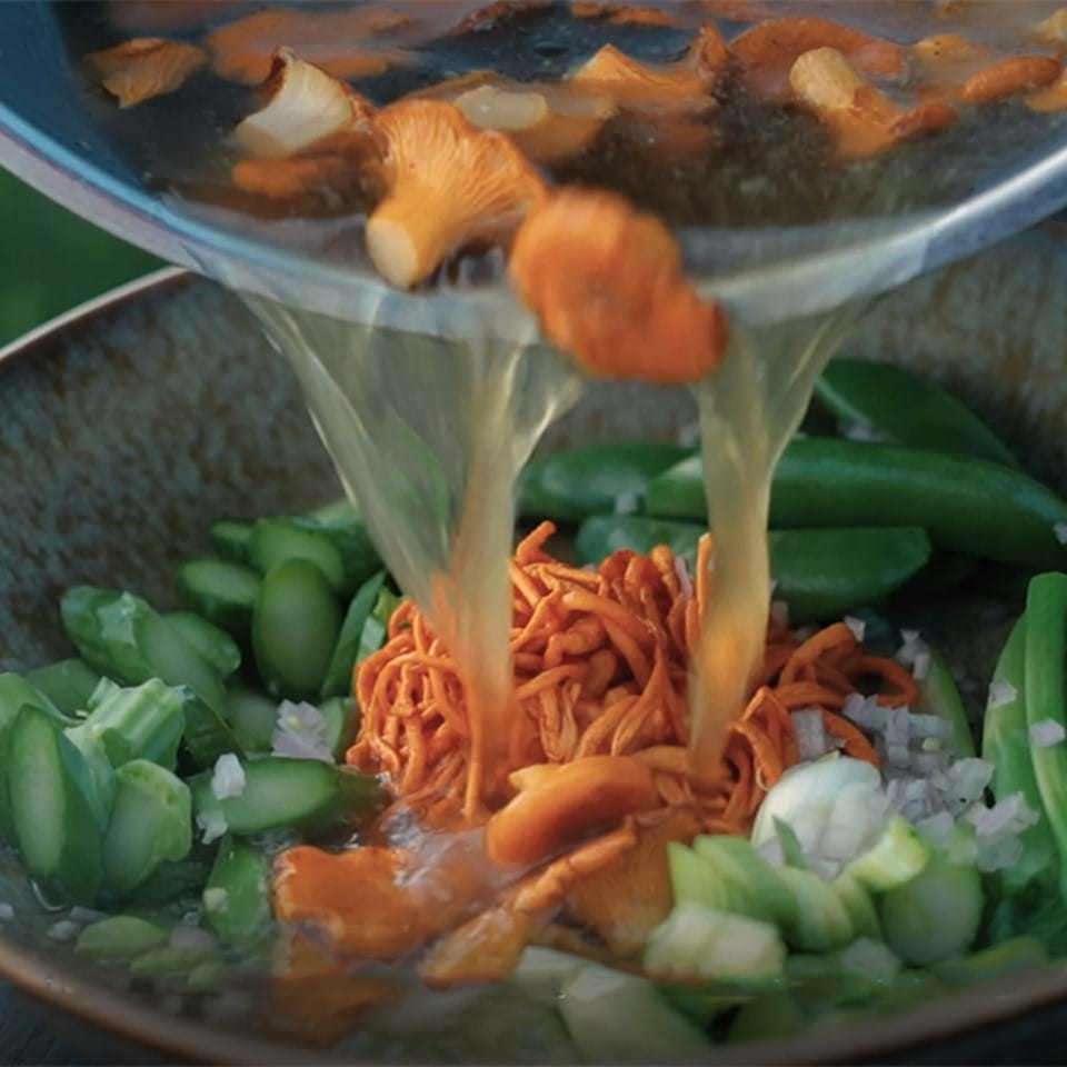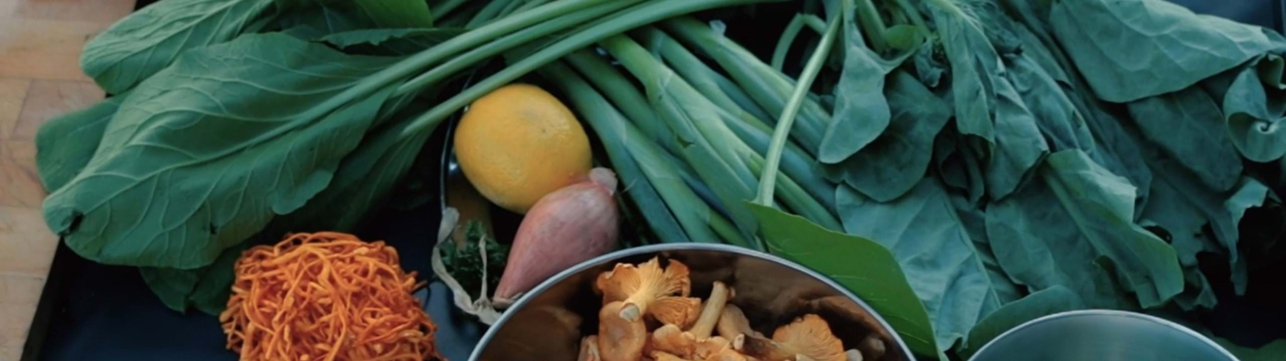 VEGGIE SOEP MET PO CHOI(CHINESE SPINAZIE) GIROLLE EN LENTE UI