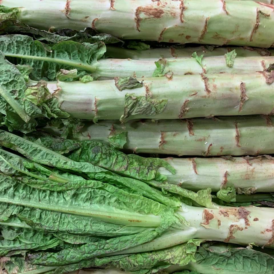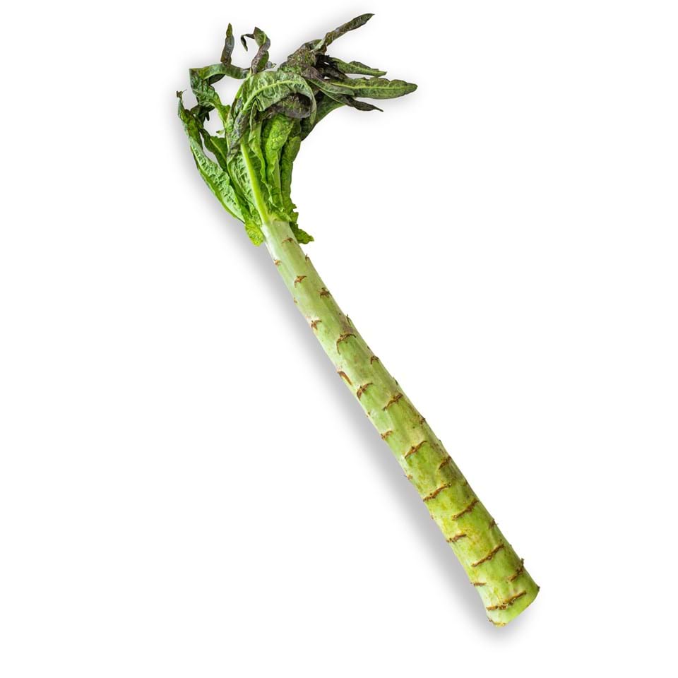 Dit is onze Chinese stengelsla. Stamt af van een eeuwenoude Chinese slasoort. Hij groeit als een plumeau op een dikke stengel. Het is een beetje een gekke veggie, maar verrassend lekker en gemakkelijk in gebruik! Het bittere blad wordt soms gegeten, maar het gaat vooral om de stengels die wel 50 cm lang en 5cm dik kunnen worden! De smaak, zit een beetje tussen sla en bladselderij in met een vleugje noot en zoet. De structuur is als van een stevige komkommer zonder zaadjes. De kleur valt ook op; doorschijnend groen.