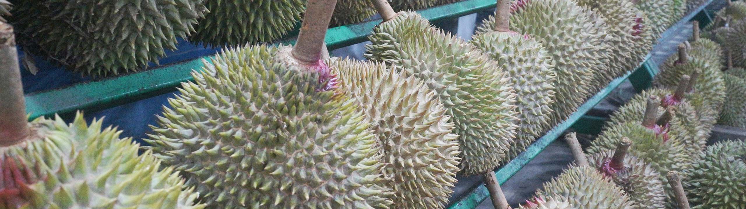 De Doerian is een tropische, groen-geel-bruine “punk” vrucht uit Indonesië en Maleisië zo groot als een rugbybal vol gevaarlijke spikes. Met van binnen een soort grote mandarijnenpartjes. De structuur doet een beetje vlezig aan, maar valt uiteen in je mond, als romige, vettige, stevige, smeuïge pudding. De smaak is zoet, friszuur en tongprikkelend zoals een licht mousserende wijn. De smaak doet denken aan licht fermenterende banaan, anderen herkennen er amandel in, soms ook ui en knoflook. Maar het bekendst is de doerian om zijn penetrante geur. Hoe rijper, hoe sterker. En het verschilt ook nog per variëteit.