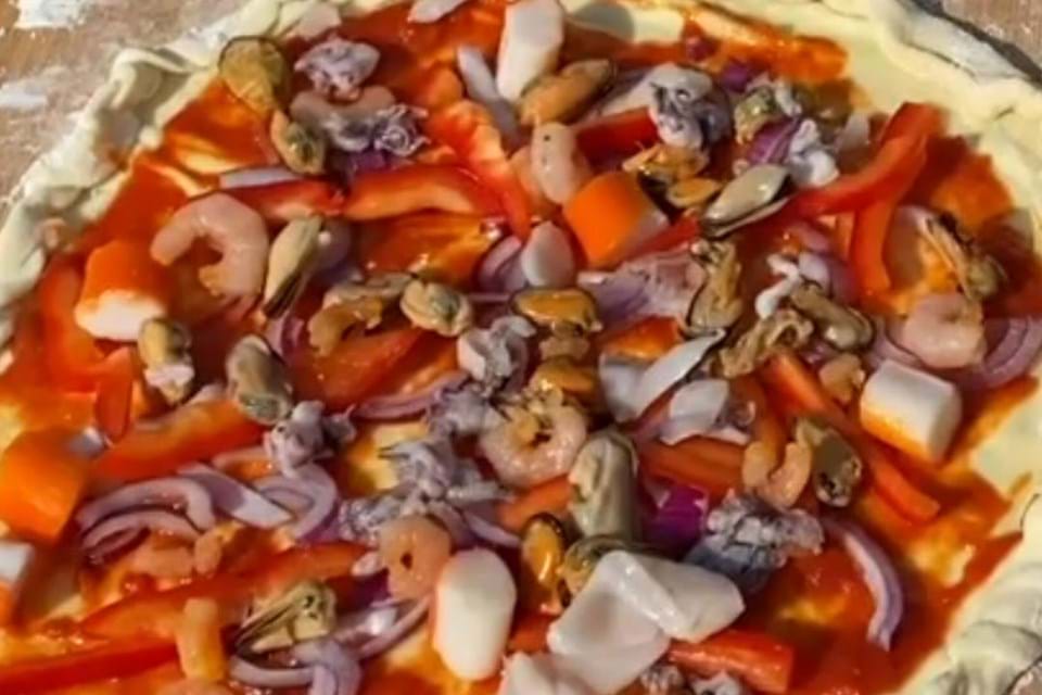 Wij hebben onze super lekkere M. Shimeji paddenstoelen en onze M. Cordyceps paddenstoelen toegevoegd aan deze zeevruchten pizza.